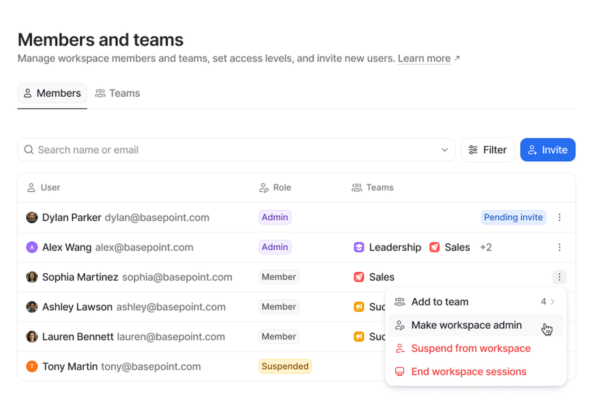 Enter the new member’s email address, choose their access level, optionally add them to teams, and click Send invite.