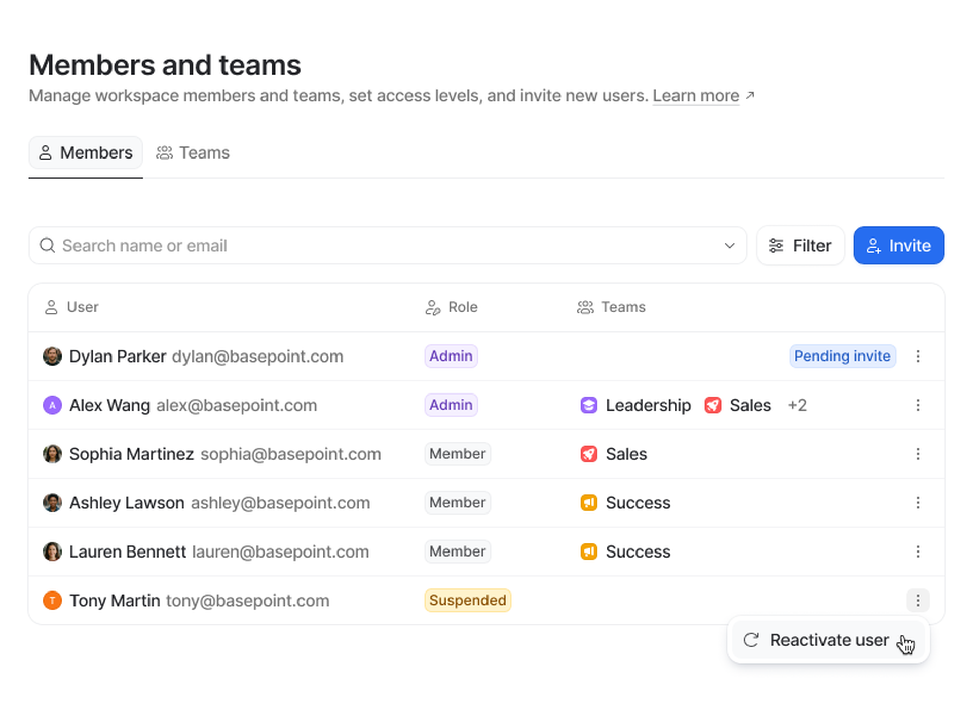 Workspace admins can reactivate suspended workspace members to restore their access to the workspace.To reactivate a suspended member, follow these steps: