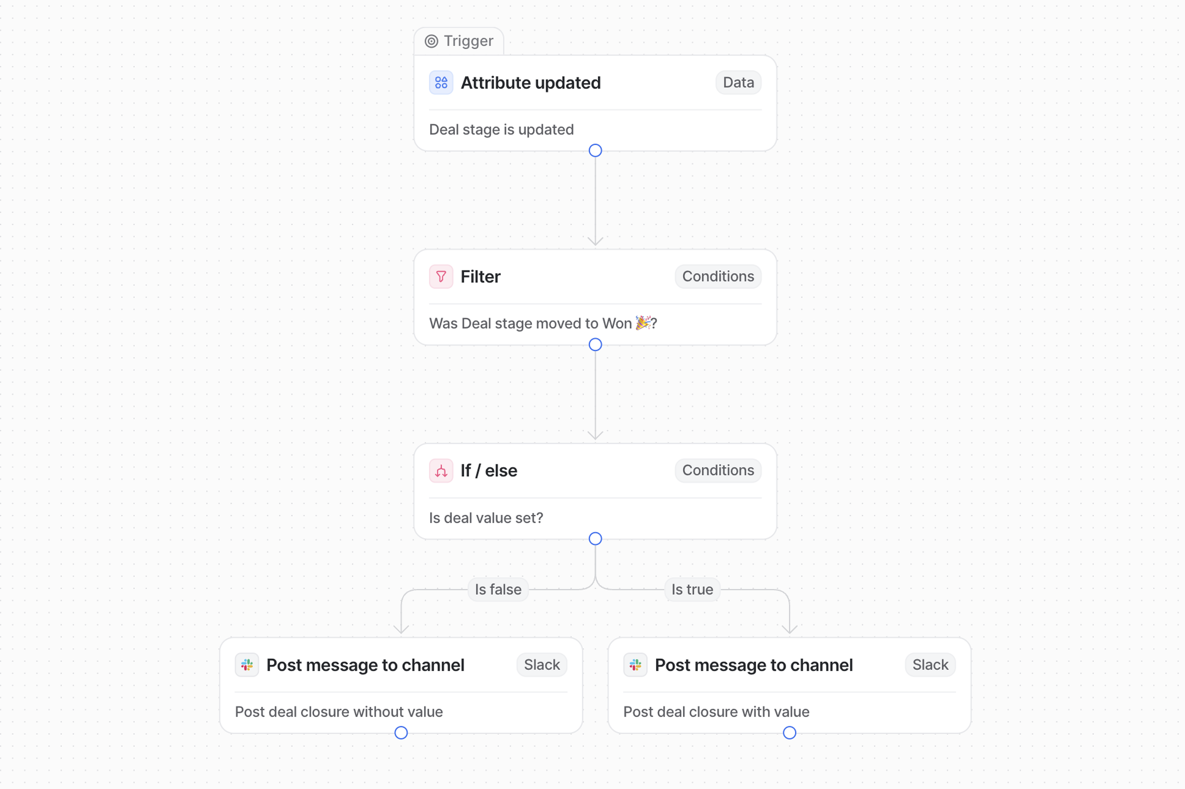 This template uses Slack with your Attio workspace by making sure everyone knows about your won deals. Every small victory is a big deal, and you can use this workflow to celebrate with your team!